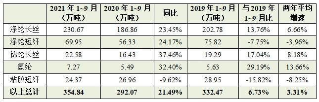 前三季度,化纤行业总体开工负荷保持高位,但进入9月,受能耗双控限电影响,开工负荷快速下降。以直纺涤纶长丝为例,9月初开工负荷约为85%,9月末降至75%左右;10月份虽然小幅回升但总体仍处于低负荷运行,月均开工负荷约77%,创年内新低。据国家统计局数据,1~9月,化纤产量为5037万吨,同比增加13.54%,以2019年1-9月为基期,化纤产量两年平均增速为6.75%。