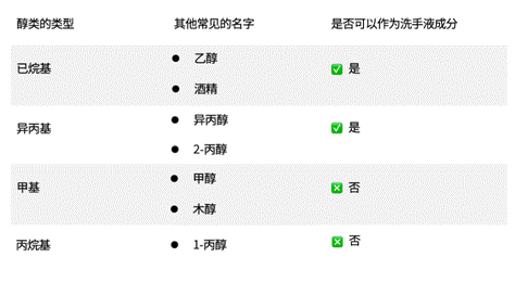 常见的几种醇类类型及是否可以用在免洗洗手液中的信息见下表: