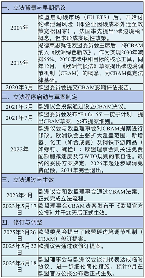 for 55”应对气候变化一揽子计划的一部分。 2022年,CBAM立法进程加速推进。3月,欧盟理事会通过了CBAM的提案,形成了“CBAM条例草案”。6月,欧洲议会投票对草案中的部分内容提出修订意见,形成了“CBAM修正案”。12月,欧盟理事会和欧洲议会就CBAM的实施达成“临时协议”。 2023年是CBAM立法的关键年份。4月18日,欧洲议会以487票赞成、81票反对和75票弃权通过了相关法案。4月25日,欧盟理事会也投票通过了该法案。5月17日,CBAM法案正式生效,并于10月1日进入为期三年的过渡期。在过渡期内,欧盟进口商需按季度报告相关商品的碳排放数据,但无需支付费用。从2026年1月1日起,CBAM将正式进入实施阶段,欧盟进口商需要购买排放证书,其价格将依据EU