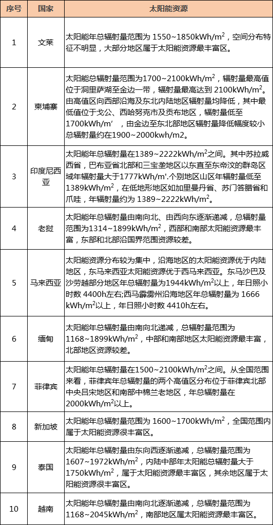 2018年底,东盟国家可再生能源占一次能源比例约为12%,距离23%的总体目标还有很大差距。再加上东盟大部分国家和地区太阳能年总辐射量大于