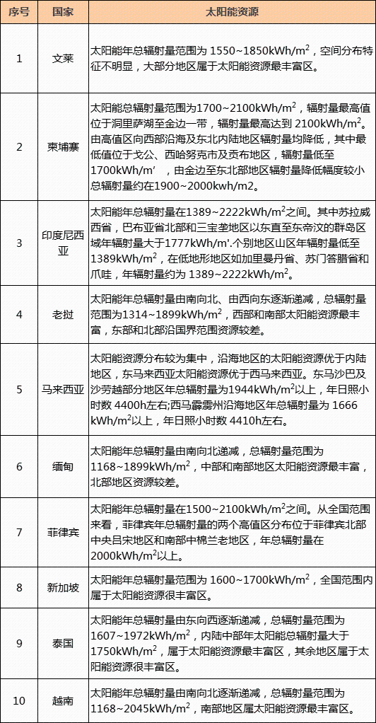 1750kWh/m2,属于太阳能资源最丰富区,从光伏发电角度而言东盟各国绝大部分地区光伏发电量在