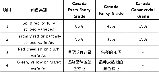 Cookers, Canada No. 1 Peelers and Canada No. 2 Peelers。 苹果色泽要求 加拿大特级(Canada Extra Fancy)、加拿大一级(Canada